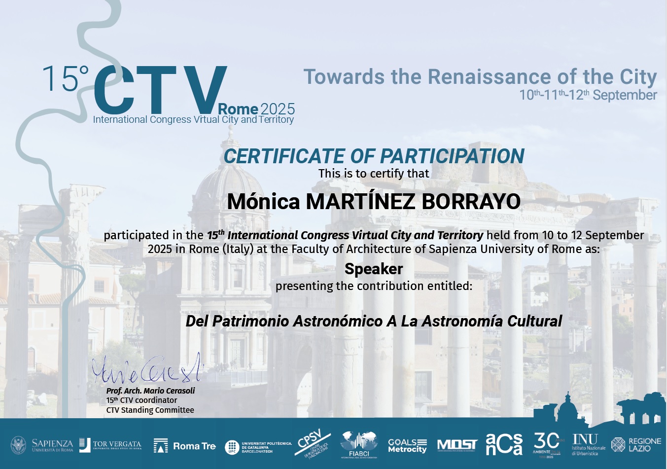 (Last Modified: 2025-10-10 10:07)El 15CTV, Roma se llevó a cabo en la Facoltá di Architettura, della Sapienza Universitá di Roma, del 10-12 septiembre 2025, en la que tuve la oportunidad de presentar la ponencia "Del Patrimonio Astronómico a la Astronomía Cultural" en colaboración con De Alba Martínez.